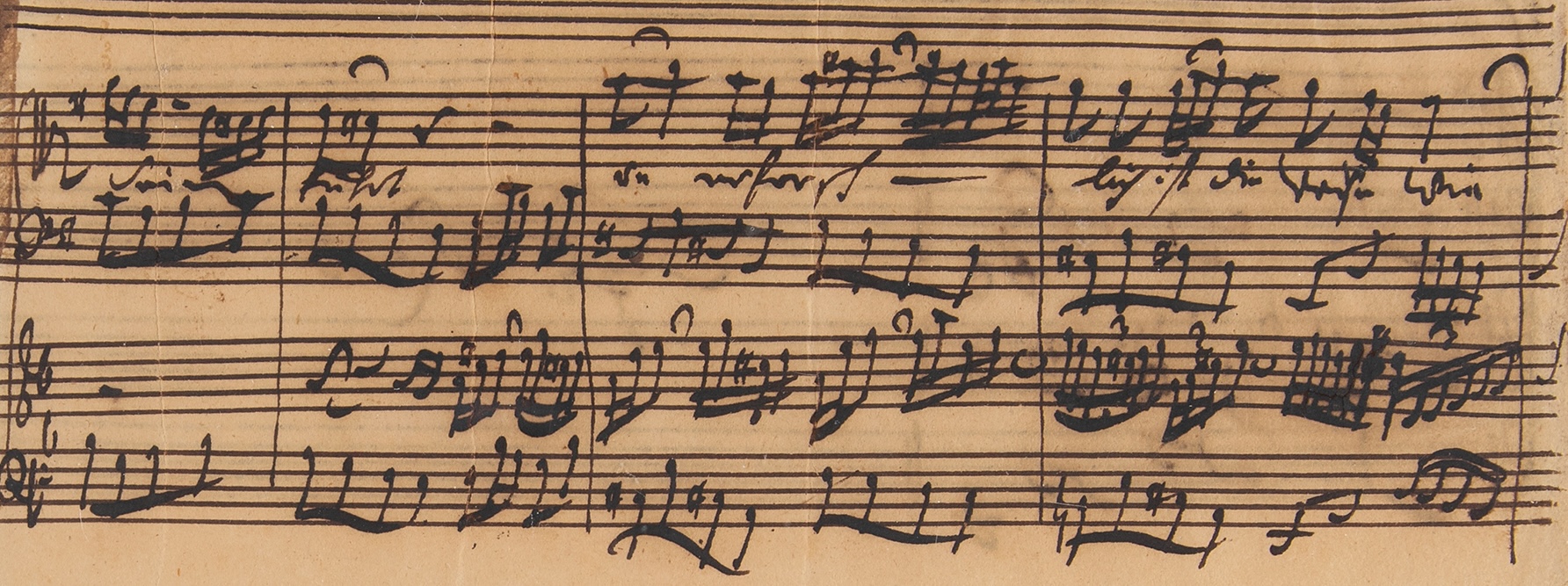The open ensemble's notes are specified on four staves: two for treble and two for bass notes. In both ranges, notes are separated out onto microtonal and chromatic staves, so that instruments with and without microtonal capabilities can address and find their notes more easily.